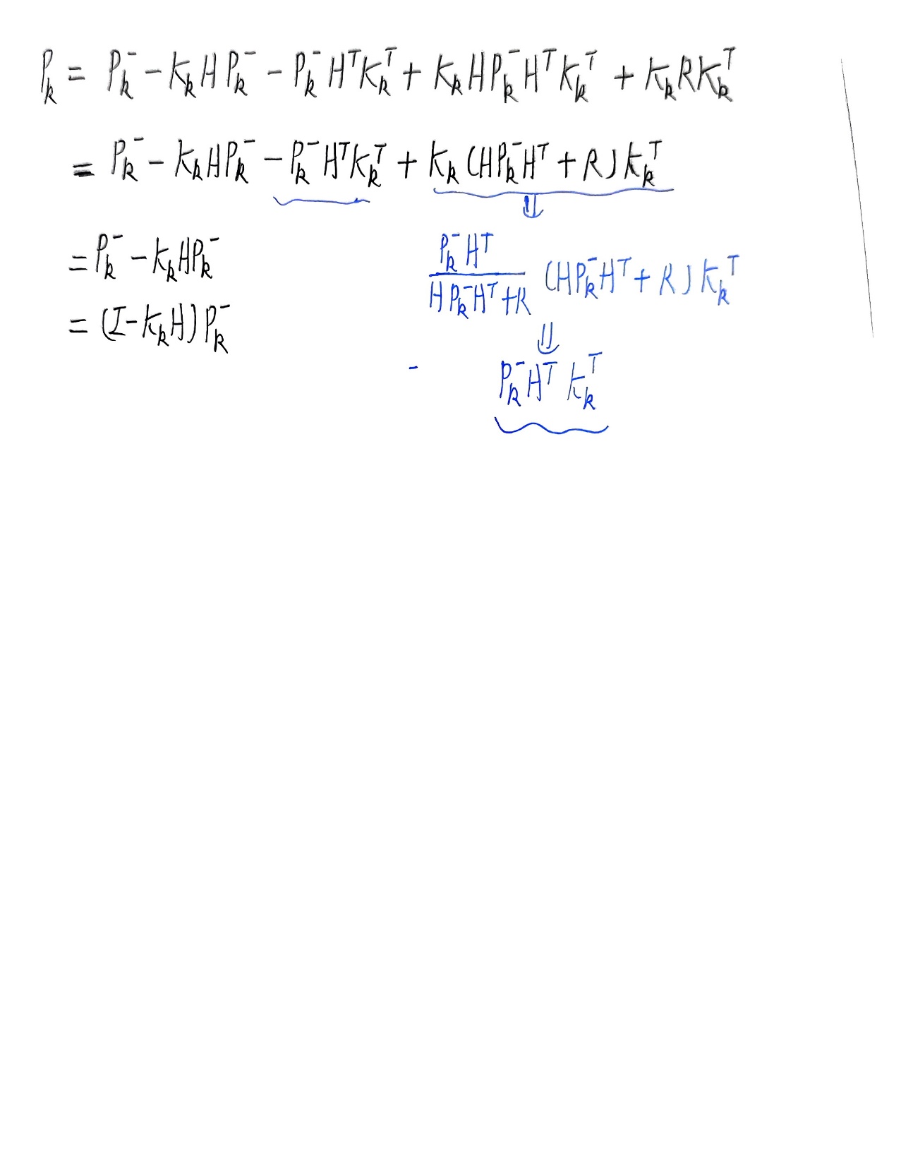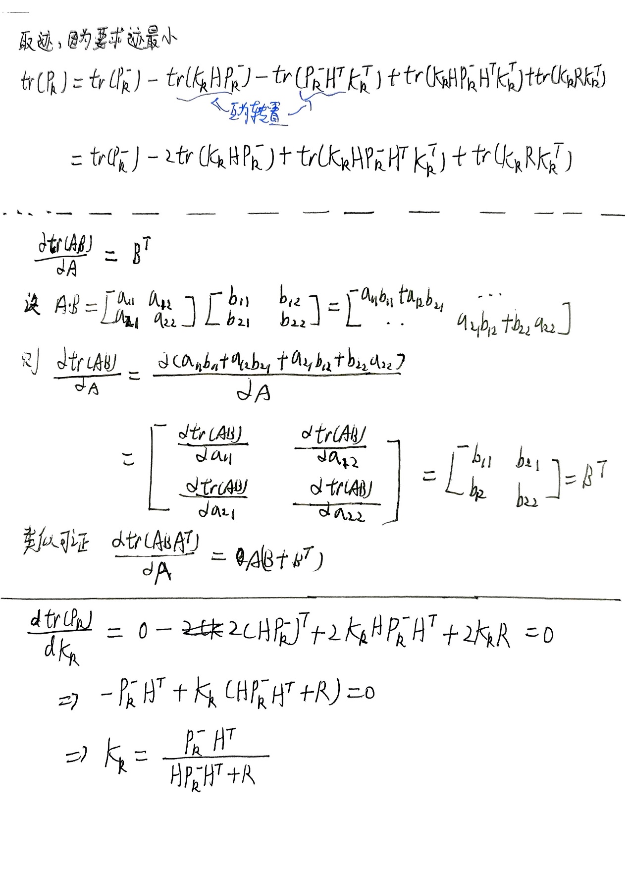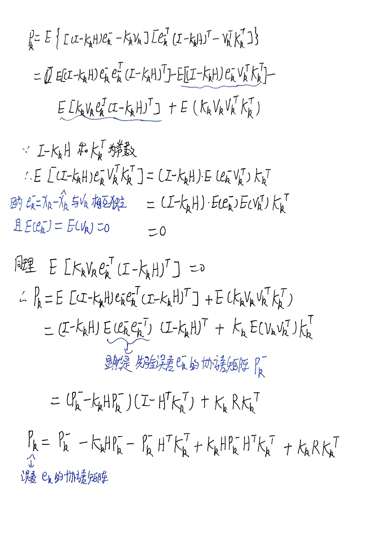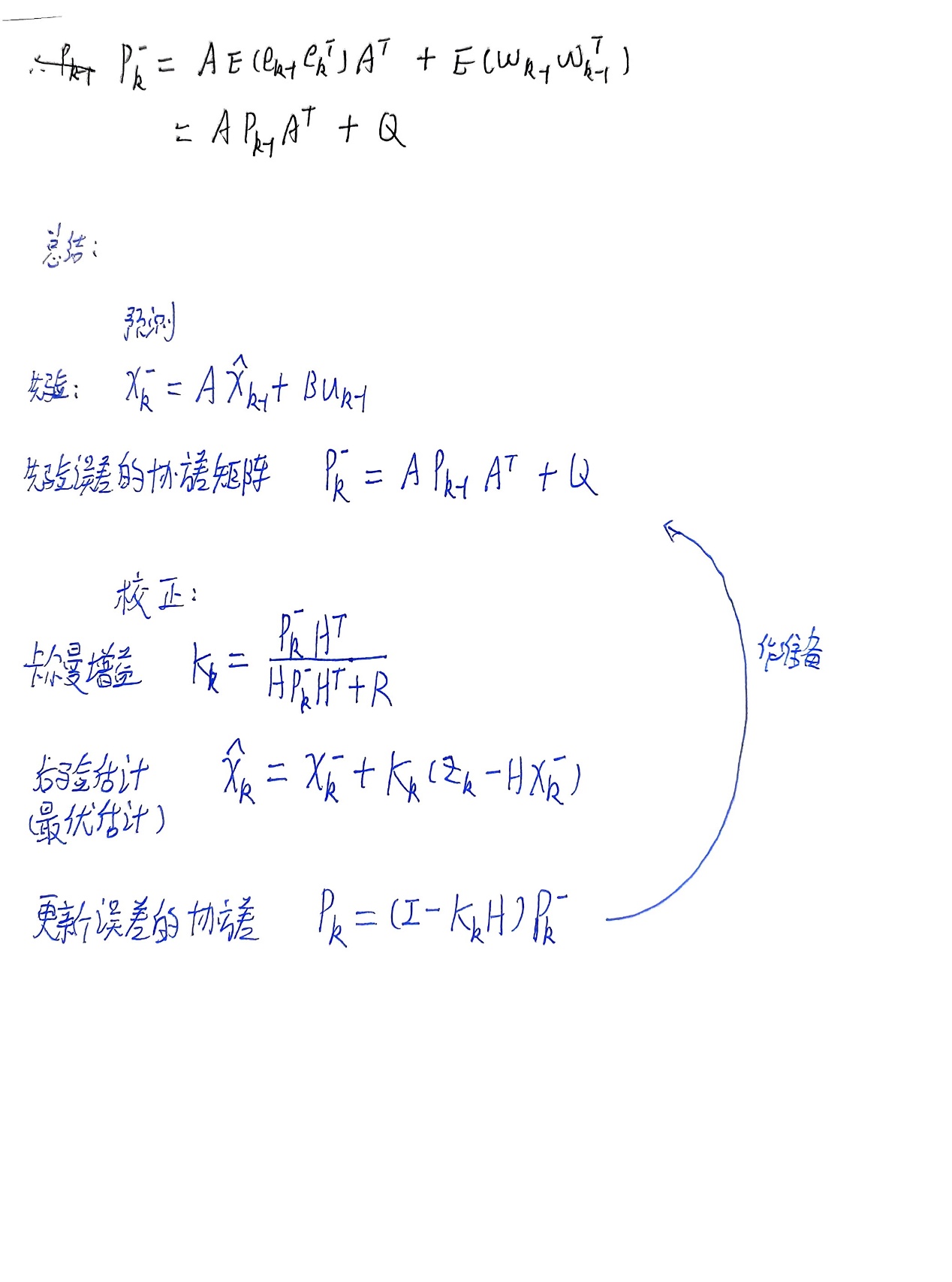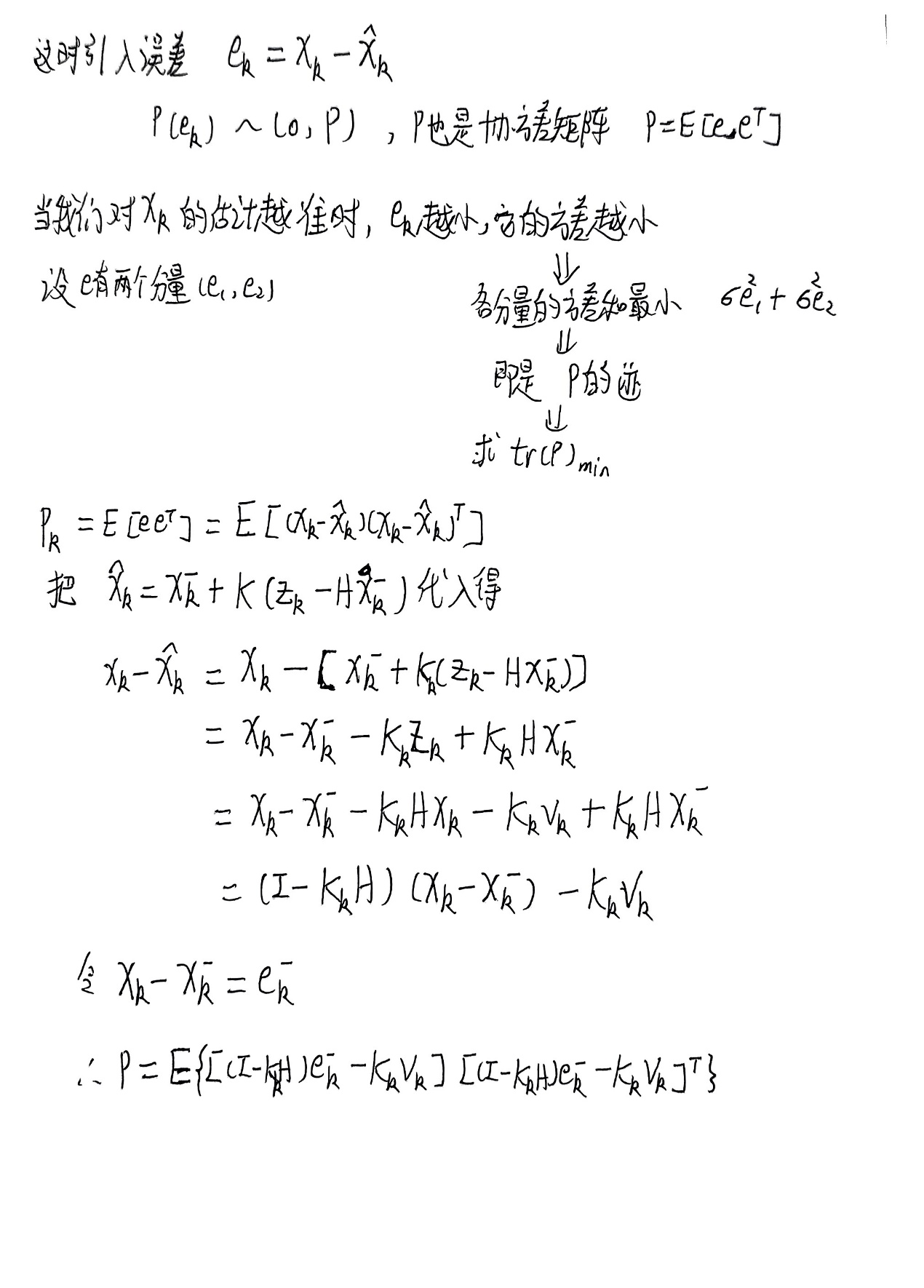 总结的五个公式就是卡尔曼滤波算法要用到的具体公式,只要给出X的初始后验估计值和误差协方差矩阵P的初始值就可以不断自动矫正得到越来越准确的状态值,在不准确之中得到最准确的估计值,这就是卡尔曼滤波的作用。下面补充误差协方差矩阵P的化简。