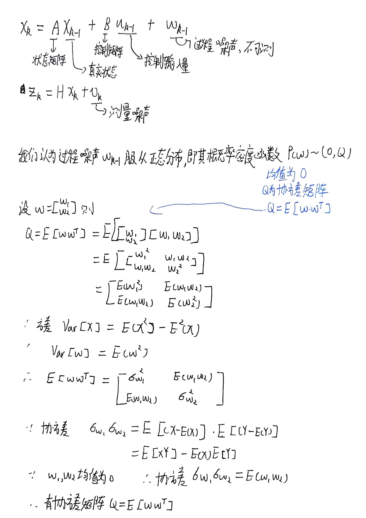 因此会有开头的两条方程,第一条为状态模型,第二条为过程模型。测量值Z可以和状态矩阵X的维度不相同(因为有可能存在观测不到的分量),比如一辆小车,它在移动的过程中同时具有速度和位置两个状态分量,但是我们可以测量得到的可能就只有它的速度,H是观测转移矩阵,就是将原本二维的状态转化为一维的测量值。