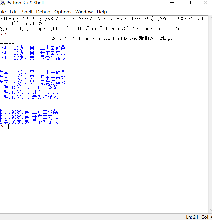 #第1种 print("小明,10岁,男,上山去砍柴") print("小明,10岁,男,开车去东北") print("小明,10岁,男,最爱打游戏") print("\n") print("老李,90岁,男,上山去砍柴") print("老李,90岁,男,开车去东北") print("老李,90岁,男,最爱打游戏") #第2种 s1=["小明","老李"] s2=["10岁","90岁"] s3=["男"] s4=["上山去砍柴","开车去东北","最爱打游戏"] for i in range(3): print("{},{},{},{}".format(s1[0],s2[0],s3[0],s4[i])) print("\n") for j in range(3): print("{},{},{},{}".format(s1[1],s2[1],s3[0],s4[j]))