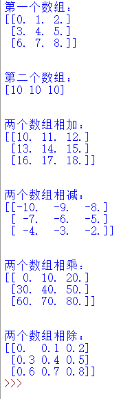 import numpy as np a = np.arange(9, dtype = np.float_).reshape(3,3) print ('第一个数组:') print (a) print ('\n') print ('第二个数组:') b = np.array([10,10,10]) print (b) print ('\n') print ('两个数组相加:') print (np.add(a,b)) print ('\n') print ('两个数组相减:') print (np.subtract(a,b)) print ('\n') print ('两个数组相乘:') print (np.multiply(a,b)) print ('\n') print ('两个数组相除:') print (np.divide(a,b))