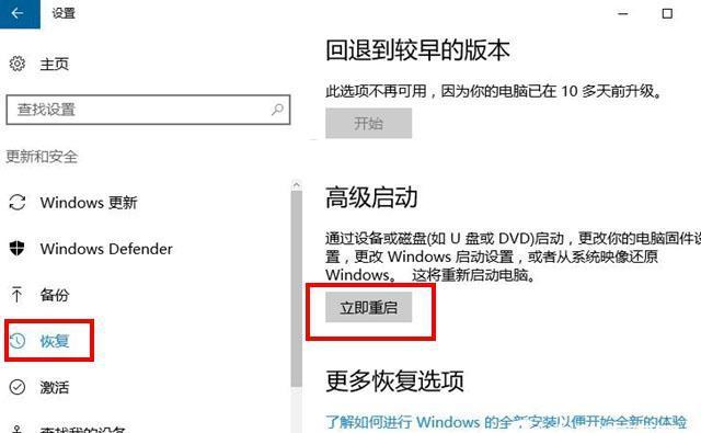 二、进来之后,在其左侧点击一下【恢复】选项,然后在右侧点击一下‘高级启动’下方的立即重启按钮即可,如图所示。