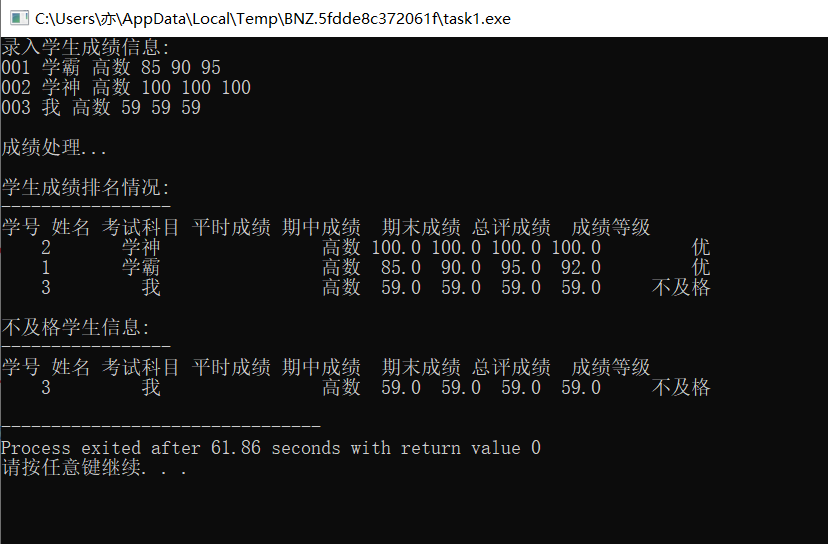 // P280例8.15 // 对教材上的程序作了微调整,把输出学生信息单独编写成一个函数模块 // 打印不及格学生信息和所有学生信息程分别调用 #include<stdio.h> #include<stdlib.h> #include<string.h> #define N 3 // 运行程序输入测试时,可以把N改小一些输入测试 typedef struct student { int id; /*学生学号 */ char name[20]; /*学生姓名 */ char subject[20]; /*考试科目 */ float perf; /*平时成绩 */ float mid; /* 期中成绩 */ float final; /* 期末成绩 */ float total; /* 总评成绩 */ char level[10]; /* 成绩等级 */ } STU; void input(STU[],int ); /*输入学生信息 */ void calc(STU[],int); /*计算总评和等级 */ int fail(STU[],STU [],int); /*不及格学生统计 */ void sort(STU[],int); /*排序 */ void print(STU[], int); /*输出学生信息*/ int main() { STU st[N],fst[N]; // 数组st记录学生信息,fst记录不及格学生信息 int k; // 用于记录不及格学生个数 printf("录入学生成绩信息:\n"); input(st,N); printf("\n成绩处理...\n"); calc(st,N); k = fail(st,fst,N); sort(st, N); printf("\n学生成绩排名情况:\n"); print(st, N); printf("\n不及格学生信息:\n"); print(fst, k); return 0; } // 输入学生信息 void input(STU s[],int n) { int i; for(i=0;i<n;i++) scanf("%d %s %s %f %f %f",&s[i].id,s[i].name,s[i].subject,&s[i].perf,&s[i].mid,&s[i].final); } // 计算总评和等级 void calc(STU s[],int n) { int i; for(i=0;i<n;i++) { s[i].total=s[i].perf*0.2+s[i].mid*0.2+s[i].final*0.6; if(s[i].total>=90) strcpy(s[i].level,"优"); // 注意:等级是字符型数组,要使用strcpy完成赋值 else if(s[i].total>=80 && s[i].total<90) strcpy(s[i].level,"良"); else if(s[i].total>=70 && s[i].total<80) strcpy(s[i].level,"中"); else if(s[i].total>=60 && s[i].total<70) strcpy(s[i].level,"及格"); else strcpy(s[i].level,"不及格"); } } // 不及格学生统计 // 数组s存放的是所有学生信息,数组t存放不及格学生信息,n是数组s中元素个数 // 函数返回值:返回的是不及格人数 int fail(STU s[],STU t[],int n) { int i,k=0; for(i=0;i<n;i++) if(s[i].total<60) t[k++]=s[i]; return k; } // 根据总评成绩对学生记录信息排序 // 使用的是冒泡排序算法 void sort(STU s[],int n) { int i,j; STU temp; for(i=0;i<n-1;i++) for(j=0;j<n-1-i;j++) if(s[j].total<s[j+1].total) { temp = s[j]; s[j] = s[j+1]; s[j+1] = temp; } } // 输出学生信息 void print(STU s[], int n) { int i; printf("-----------------\n"); printf("学号 姓名 考试科目 平时成绩 期中成绩 期末成绩 总评成绩 成绩等级\n"); for(i=0;i<n;i++) printf("%5d %10s%20s %5.1f %5.1f %5.1f %5.1f %10s\n",s[i].id,s[i].name,s[i].subject,s[i].perf,s[i].mid,s[i].final,s[i].total,s[i].level); }