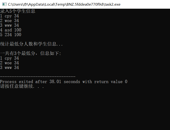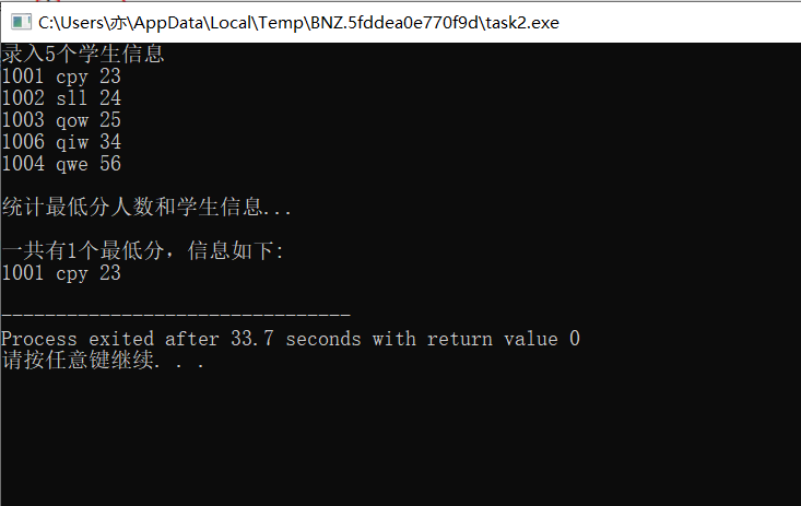 #include <stdio.h> const int N=5; // 定义结构体类型struct student,并定义STU为其别名 typedef struct student { long no; char name[20]; int score; }STU; // 函数声明 void input(STU s[], int n); int findMinlist(STU s[], STU t[], int n); void output(STU s[], int n); int main() { STU stu[N], minlist[N]; int count; printf("录入%d个学生信息\n", N); input(stu, N); printf("\n统计最低分人数和学生信息...\n"); count = findMinlist(stu, minlist, N); printf("\n一共有%d个最低分,信息如下:\n", count); output(minlist, count); return 0; } // 输入n个学生信息,存放在结构体数组s中 void input(STU s[], int n) { int i; for(i=0; i<n; i++) scanf("%ld %s %d", &s[i].no, s[i].name, &s[i].score); } // 输出结构体s中n个元素信息 void output(STU s[], int n) { int i; for(i=0; i<n; i++) printf("%ld %s %d\n", s[i].no, s[i].name, s[i].score); } // 在结构体数组s中,查找最低分学生的记录,将其存入结构体数组t中 // 形参n是结构体数组s中元素个数 // 函数返回最低分的学生人数 int findMinlist(STU s[], STU t[], int n) { int flag=0,min=0,i,j; for(i=0;i<n;i++) { for(j=i+1;j<n;j++) { if(s[j].score<s[flag].score) { flag=j; } } } for(i=0;i<n;i++) { if(s[i].score==s[flag].score) { t[min++]=s[i]; } } return min; }
