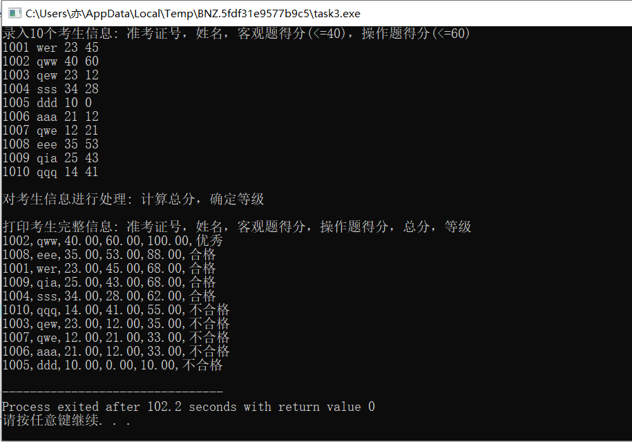 #include <stdio.h> #include <string.h> #include <stdlib.h> const int N = 10; // 定义结构体类型struct student,并定义其别名为STU typedef struct student { long int id; char name[20]; float objective; /*客观题得分*/ float subjective; /*操作题得分*/ float sum; char level[10]; }STU; // 函数声明 void input(STU s[], int n); void output(STU s[], int n); void process(STU s[], int n); int main() { STU stu[N]; printf("录入%d个考生信息: 准考证号,姓名,客观题得分(<=40),操作题得分(<=60)\n", N); input(stu, N); printf("\n对考生信息进行处理: 计算总分,确定等级\n"); process(stu, N); printf("\n打印考生完整信息: 准考证号,姓名,客观题得分,操作题得分,总分,等级\n"); output(stu, N); return 0; } // 录入考生信息:准考证号,姓名,客观题得分,操作题得分 void input(STU s[], int n) { int i; for(i=0;i<n;i++) { scanf("%ld %s %f %f",&s[i].id,s[i].name,&s[i].objective,&s[i].subjective); if(s[i].objective>40&&s[i].subjective>60) exit(0); } } //输出考生完整信息: 准考证号,姓名,客观题得分,操作题得分,总分,等级 void output(STU s[], int n) { int i; for(i=0;i<n;i++) { printf("%ld,%s,%.2f,%.2f,%.2f,%s",s[i].id,s[i].name,s[i].objective,s[i].subjective,s[i].sum,s[i].level); printf("\n"); } } // 对考生信息进行处理:计算总分,排序,确定等级 void process(STU s[], int n) { STU temp; int i,j,k; for(i=0;i<n;i++) { s[i].sum=s[i].objective+s[i].subjective; } for(i=0;i<n;i++) { k=i; for(j=i+1;j<n;j++) { if(s[j].sum>s[k].sum) { k=j; } } if(k!=i) { temp=s[i]; s[i]=s[k]; s[k]=temp; } } for(i=0;i<n;i++) { if(i+1<=0.1*n) strcpy(s[i].level,"优秀"); else if(i+1<=0.5*n&&i+1>0.1*n) strcpy(s[i].level,"合格"); else strcpy(s[i].level,"不合格"); } }