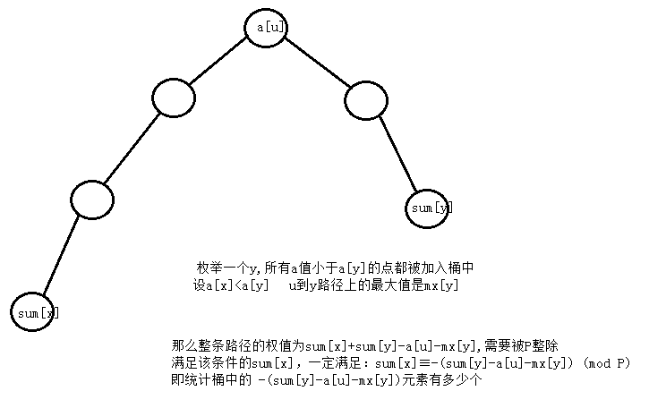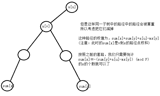 给定一棵有n个节点的无根树,树上的每个点有一个非负整数点权。定义一条路径的价值为路径上的点权和-路径上的点权最大值。 给定参数P,我!=们想知道,有多少不同的树上简单路径,满足它的价值恰好是P的倍数。 注意:单点算作一条路径;u!=v时,(u,v)和(v,u)只算一次。