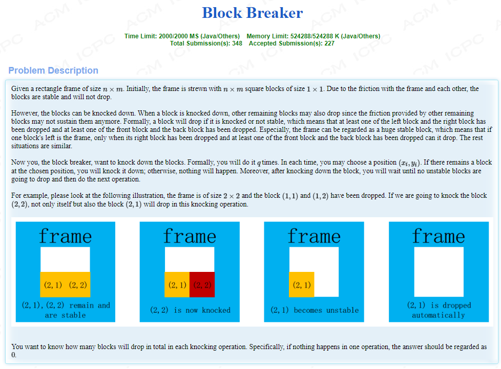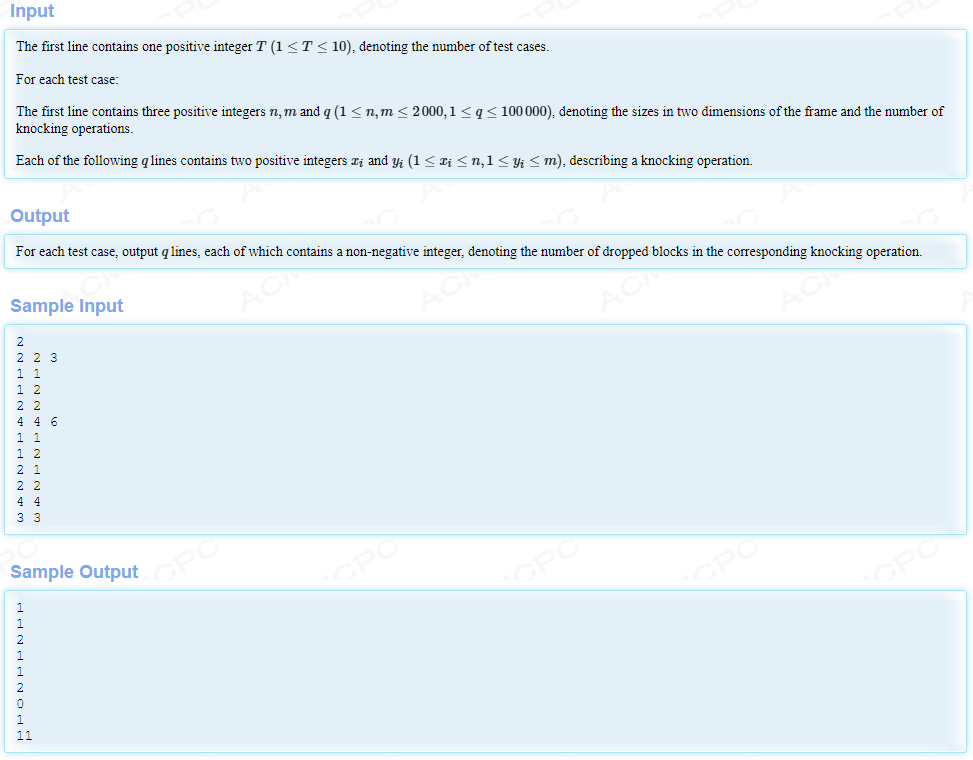 你有一个n*m的矩形,每个位置都有一个方块,当一个方块它(上下都有稳定方块)或者(左右都有稳定方块)时,它就是稳定的,否则他也会成为不稳定方块并且掉落,现在有q组询问,每次敲掉一个位于(xi,yi)方块(可能不存在),求每一次敲击后会掉落多少方块。