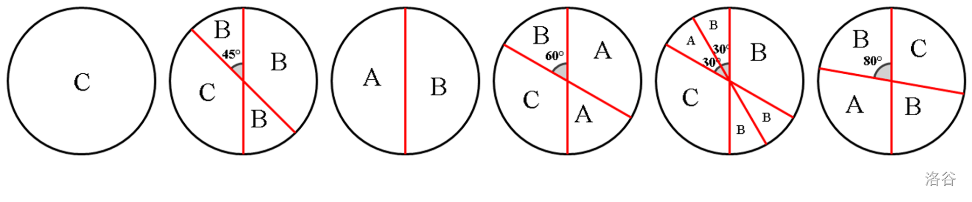 \(1.\) 每次切蛋糕可以选择蛋糕的任意一条直径,并沿这条直径切一刀(注意切完后不会立刻将蛋糕分成两部分)。