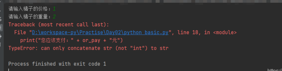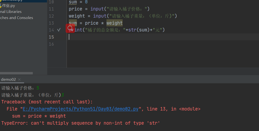 1 price = input("请输入橘子价格:") 2 weight = input("请输入橘子重量:(单位:斤)") 3 sum = int(price) * int(weight) 4 print("橘子的总金额是:"+str(sum)+"元")