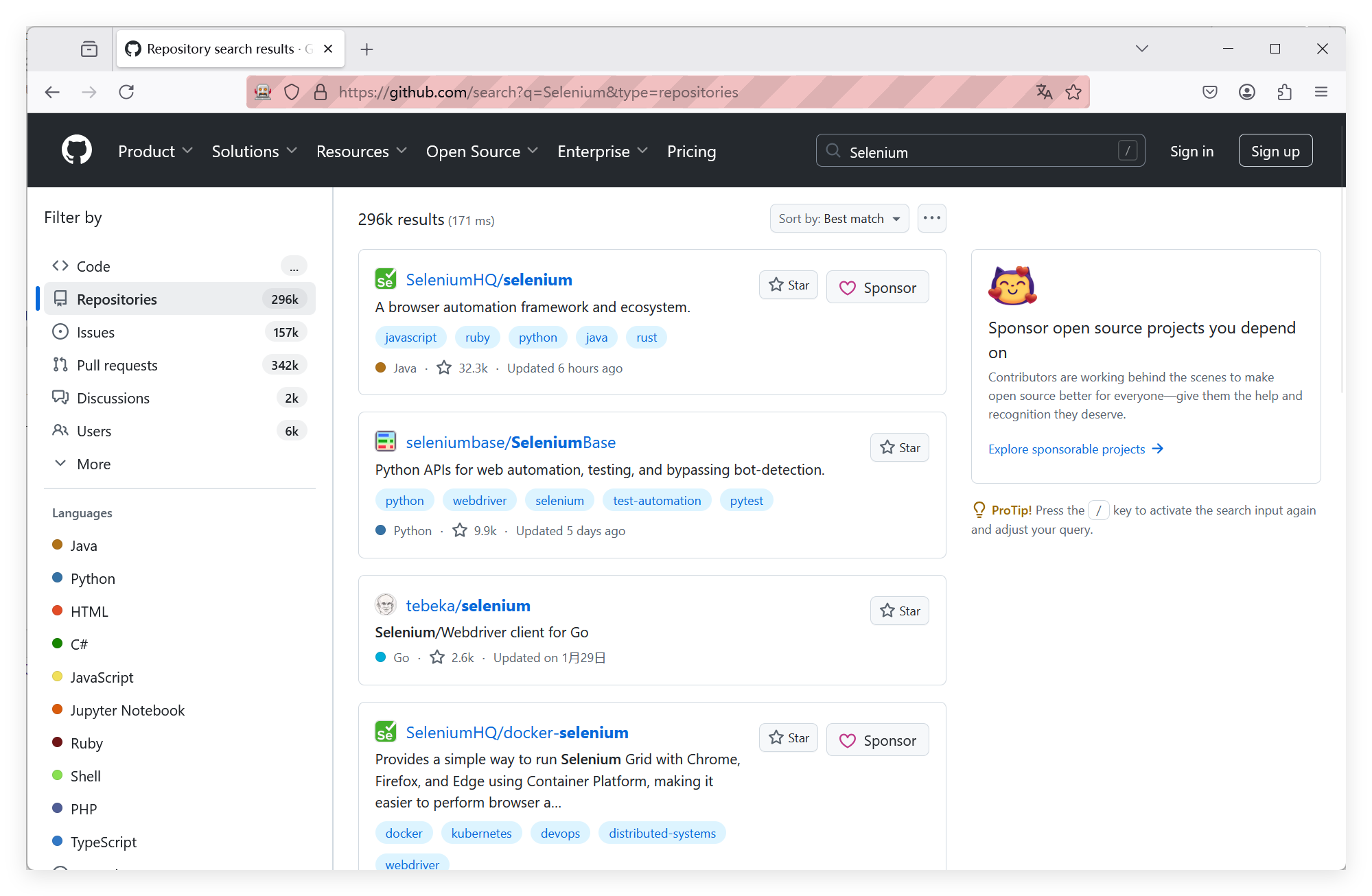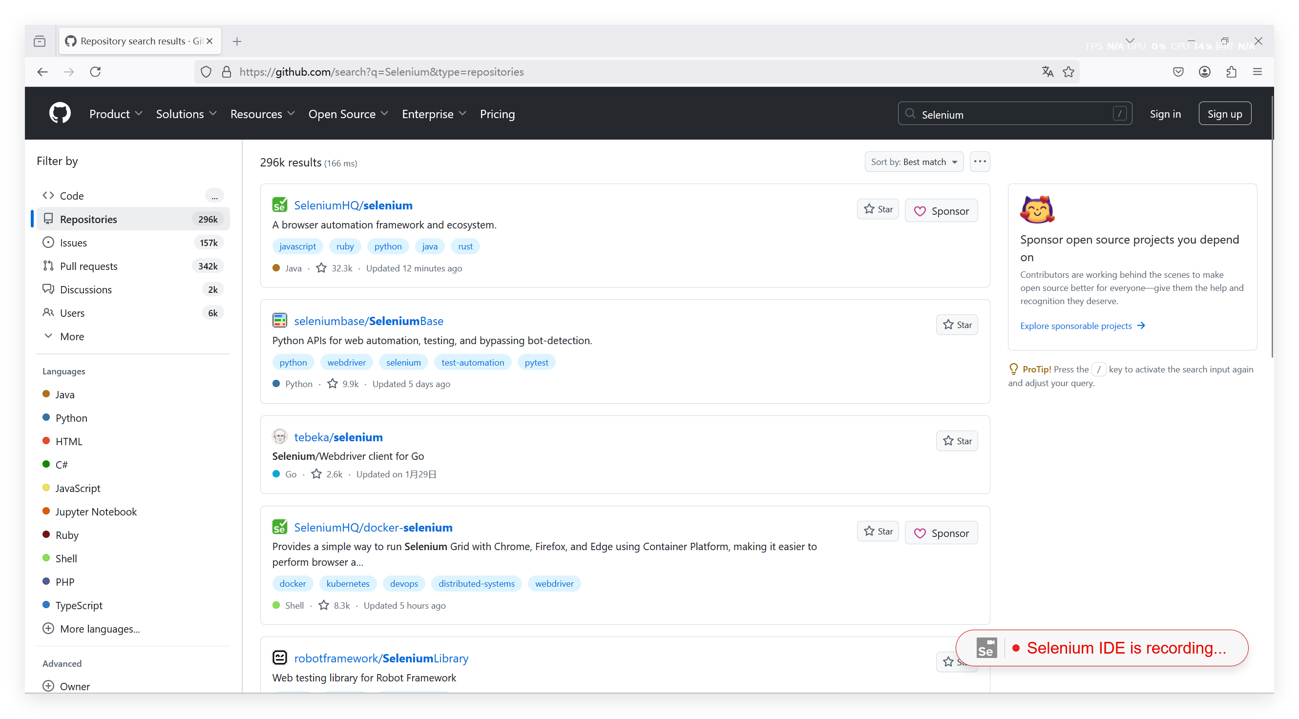 到这里就可以了,运行后能正常打开火狐浏览器和github并且搜索Selenium,如果打不开浏览器可能是那个geck的版本和你的火狐版本不匹配,尝试更新火狐或调整geck版本,如果打不开github还是老问题,建议挂梯子