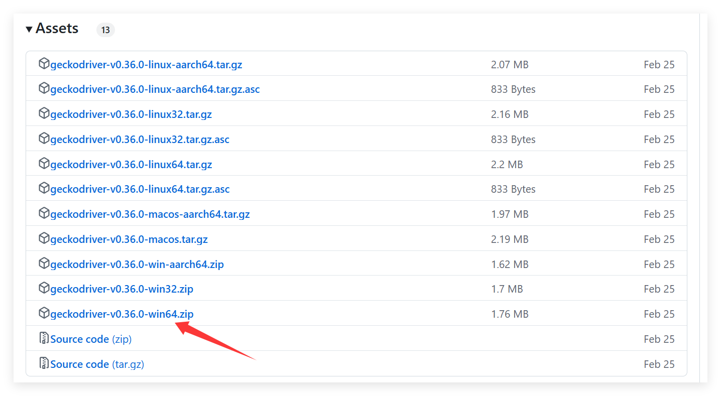 别急着运行代码,还少个文件,进入网址Releases · mozilla/geckodriver下载火狐运行的驱动(因为这个比较稳定,所以使用这个来教程,是可以用代码跳过这一步的),进不来网址的挂梯子或者尝试换DNS多等等