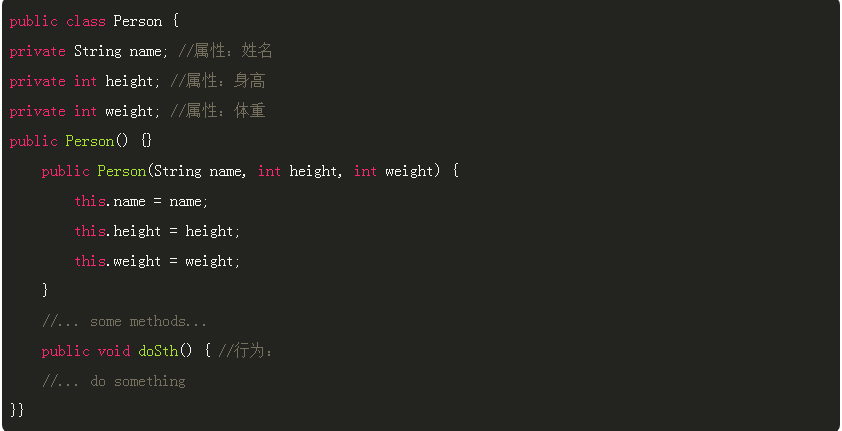 举一个例子说明下类,比如Person(人)就是一个类,那么具体的某个人“张三”就是“人类”这个类的对象,而“姓名、身高、体重”等信息就是对象的属性,人的动作比如“吃饭、穿衣”等就是对象的方法。