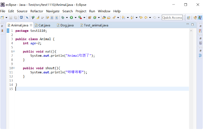 (1)动物类中创建年龄变量,并赋值为2,再创建一个eat成员方法和shout方法