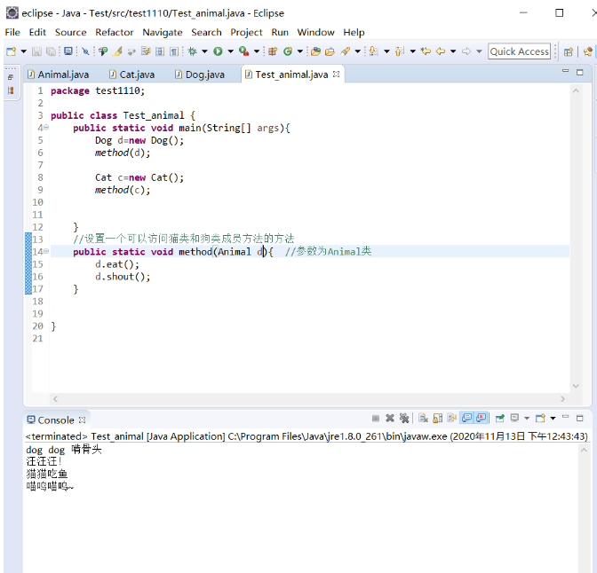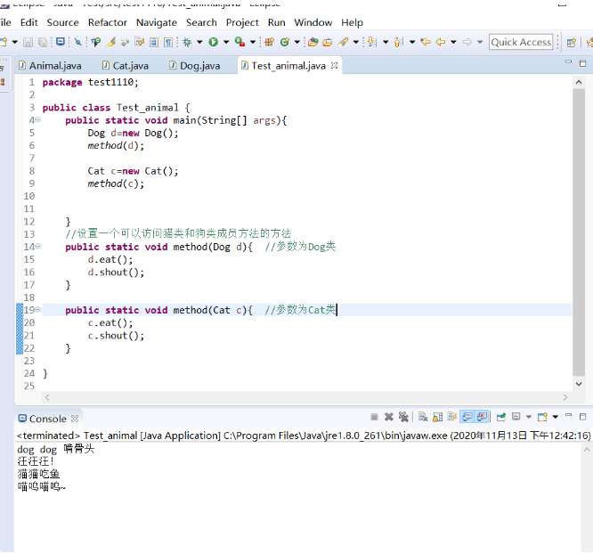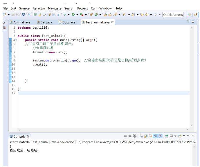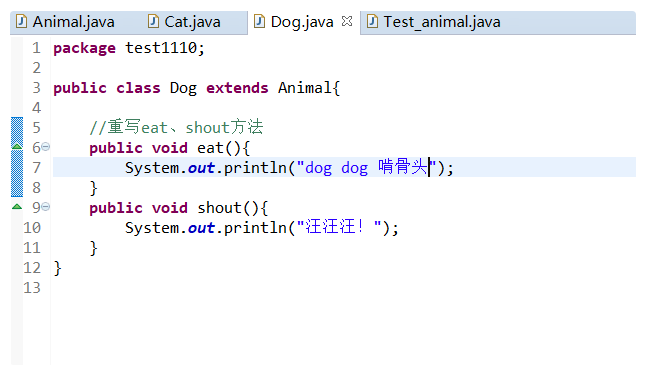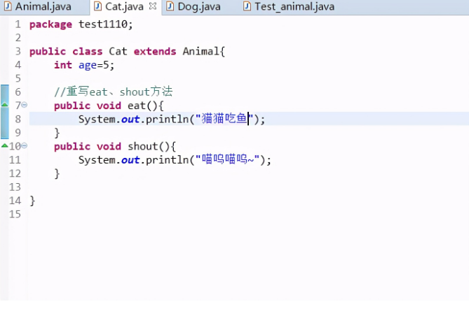 (2)猫类中创建年龄变量,并赋值为5;重写eat方法和shout方法