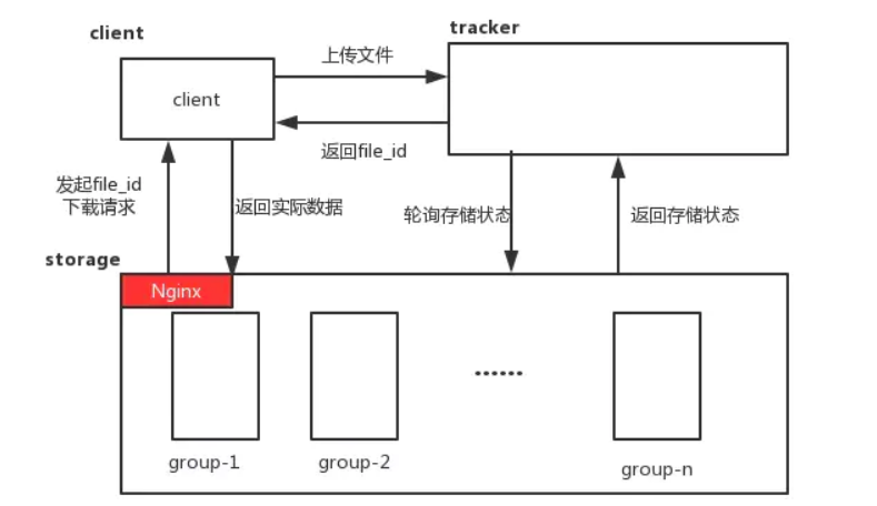 文件上传:Client会先向Tracker询问存储地址,Tracker查询到存储地址后返回给Client,Client拿着地址直接和对应的Storage通讯,将文件上传至改Storage。