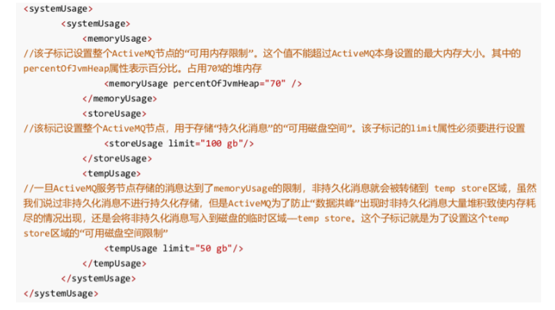 Ø从上面的配置我们需要get到一个结论,当非持久化消息堆积到一定程度的时候,也就是内存超过指定的设置阀值时,ActiveMQ会将内存中的非持久化消息写入到临时文件,以便腾出内存。但是它和持久化消息的区别是,重启之后,持久化消息会从文件中恢复,非持久化的临时文件会直接删除