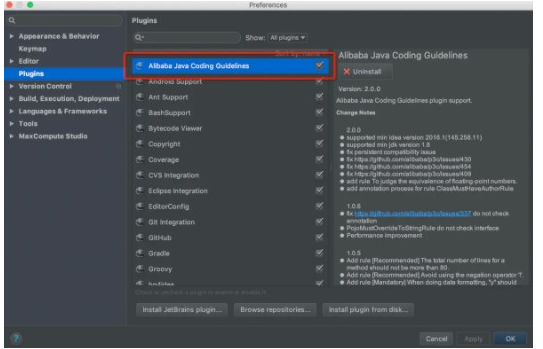 由于使用的mac所有以Mac下idea插件安装流程为例,首先进入idea的preferences,点击plugin选项,然后搜索Alibaba Java Coding Guidelines插件进行下载,如下图所示。