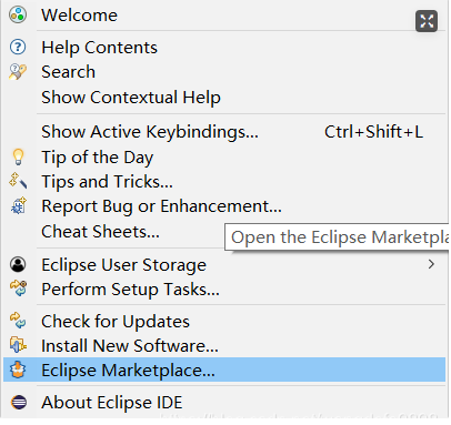 打开eclipse–>在菜单栏中找到Help–>选择Eclipse Marketplace