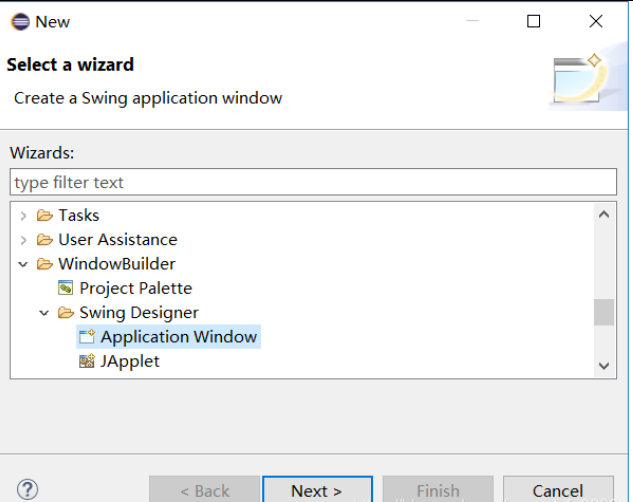 再下面找到WindowBuilder文件,选择其中的Swing Design中的第一个Application Window–>next,取个名字