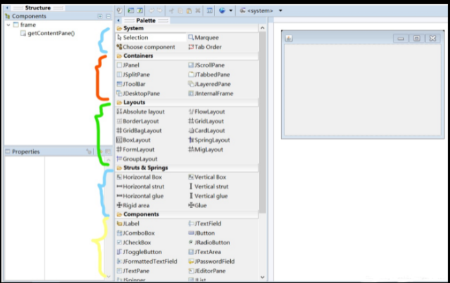 3.绿色:里面是各种布局,不同的布局效果不同,比如第一个绝对布局就是最自由的,不过用WindowBuilder一般默认的布局都是箱式布局或流式布局,最好用的还是绝对布局,自由度非常高,想怎么放都行,当然可以通过画布的组合实现不同布局的组合,建议多试试。