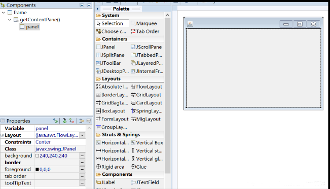 也很简单,就是点击你需要的东西,然后加到右边的空白的框框里就好了,比如我们加一个JPanel进去。右下方就是这个画布的基础信息了,第一行是变量名,第二行是布局,比如现在的布局默认流式布局,下面就是各种各样的信息,包括背景,边框等等。