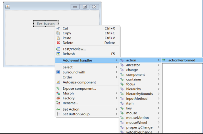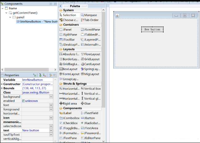 我们先将画布的布局改成绝对布局Absolute,然后我们在这个布局中加一个按钮JButton