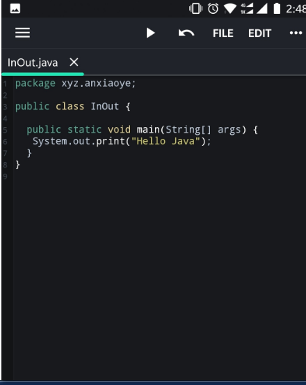 我们点击 InOut.java ,编写具体代码,这里就以最简单的栗子来讲,即输出 Hello Java。