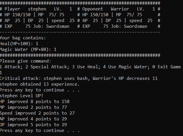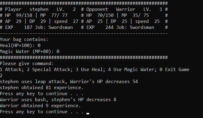 cout << "1 Attack; 2 Special Attack; 3 Use Heal; 4 Use Magic Water; 0 Exit Game" << endl;