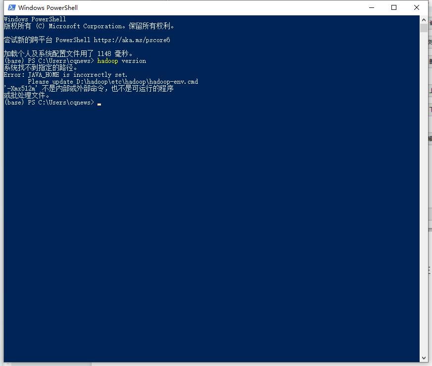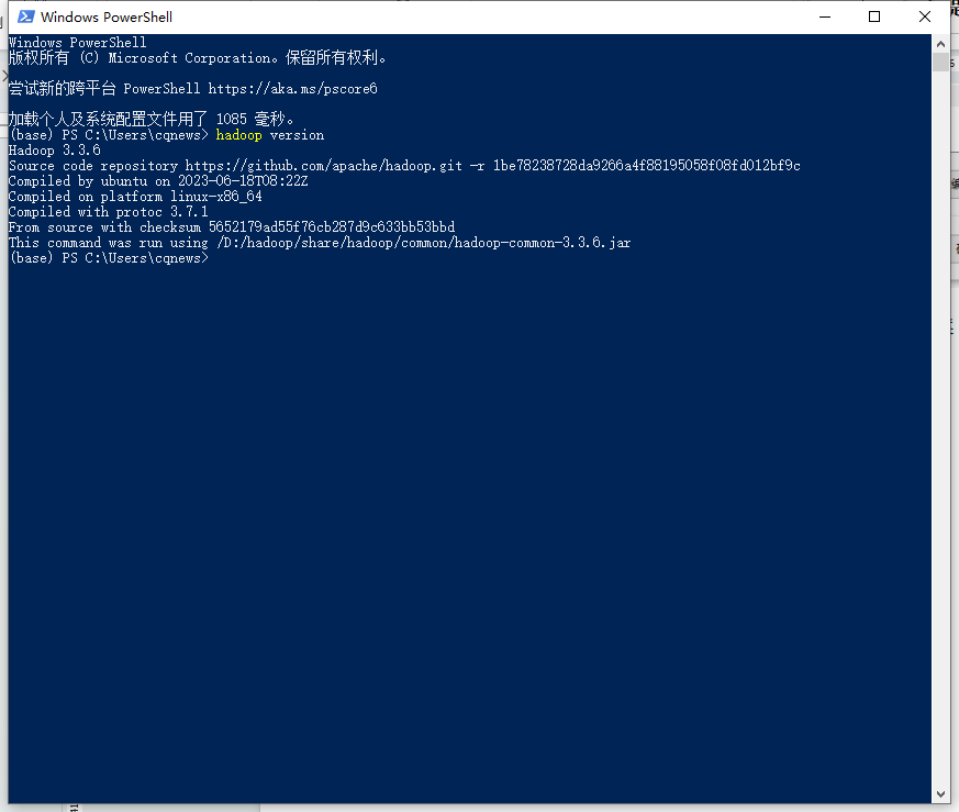 在配置环境变量后我们检查一下环境变量是否生效,在cmd或powershell下运行 hadoop version 看看情况