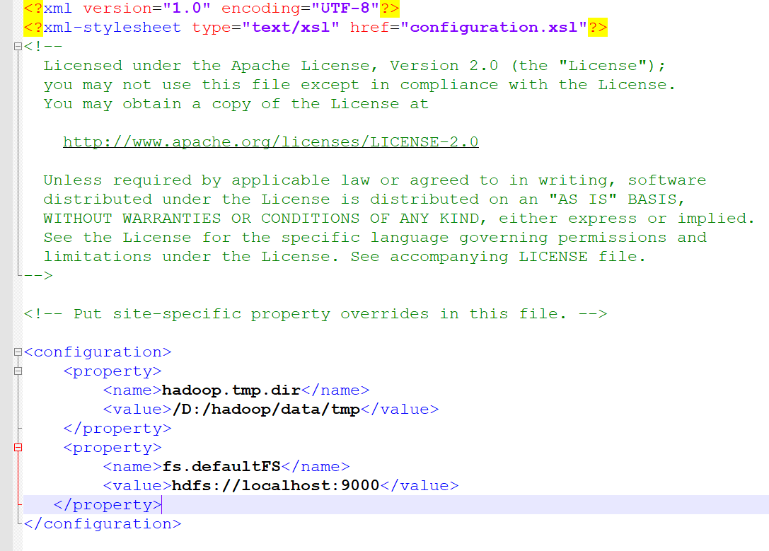 core-site.xml配置文件在 D:\hadoop\etc\hadoop下面,core-site.xml文件是 Hadoop 配置文件之一,用于配置 Hadoop 的核心参数。这些参数定义了 Hadoop 集群的基本行为和特性,包括文件系统的默认配置、网络设置、安全设置等。