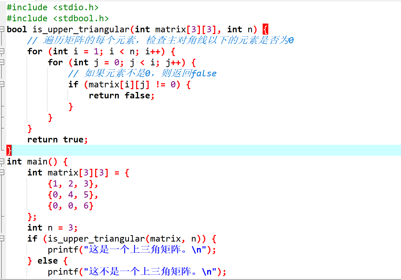 (7)判断上三角矩阵。上三角矩阵指主对角线以下的元素都为0的矩阵;主对角线为从矩阵的左上角至右下角的连线。本题要求编写程序,判断一个给定的方阵是否上三角矩阵。   (8)给定一个按升序排列的二维数组,编写一个函数来判断目标值是否存在于数组中。数组是一个m x n的矩阵,可使用算法快速查询。#include <stdio.h>