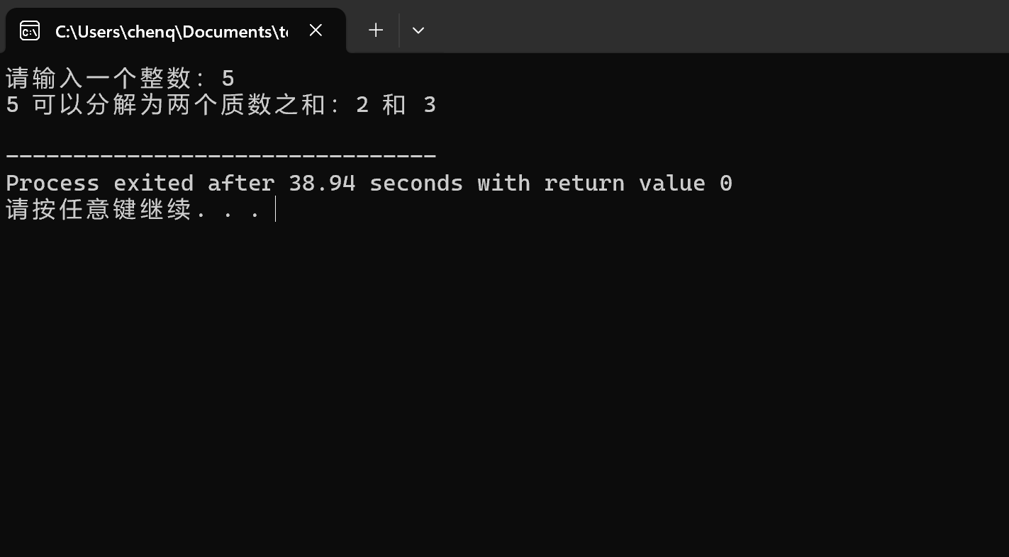 printf("%d 可以分解为两个质数之和:%d 和 %d\n", n, a, b);
