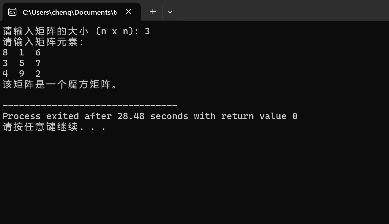 (11)写一个程序读入一个二维整型数组并判断它是否为魔方矩阵。在魔方阵中,所有的行、列和对角线都拥有相同的和。