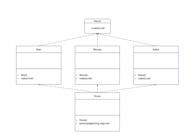 使用简单工厂模式模拟女娲(Nvwa)造人(Person),如果传入参数M,则返回一个Man对象,如果传入参数W,则返回一个Woman对象,如果传入参数R,则返回一个Robot对象。请用程序设计实现上述场景。