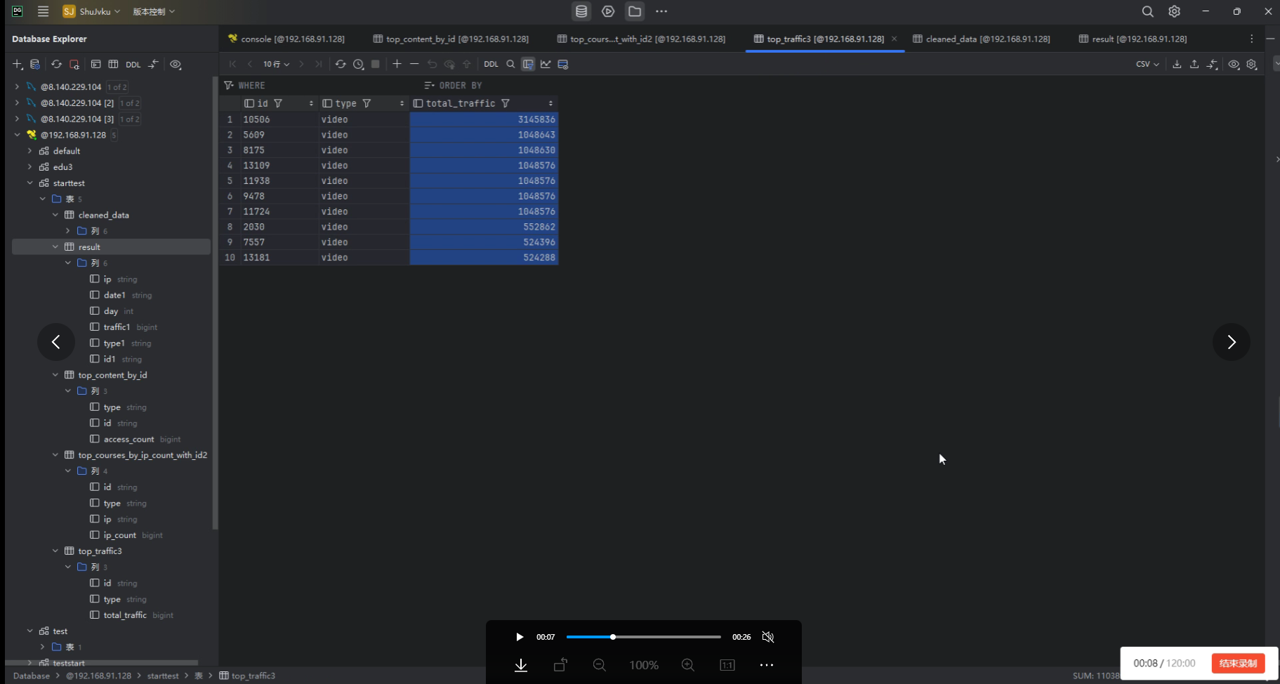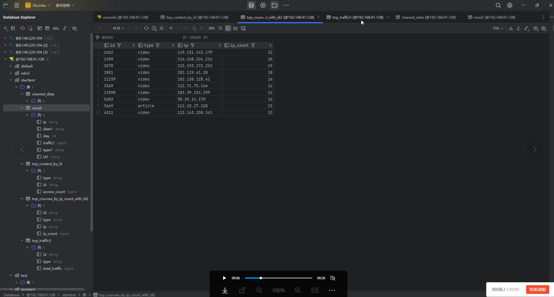 然后使用sqoop将hive中统计出来的数据传递到本地mysql数据库中,