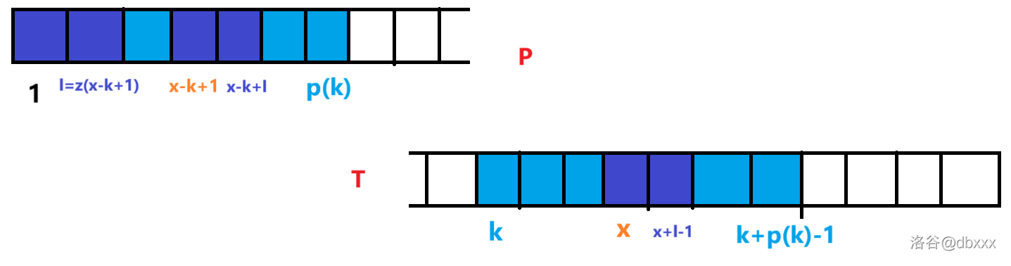 在这里因为分裂为两个字符串,蓝色部分变成了 \(p(k)\),但紫色部分仍然对应的是 \(z(x - k + 1)\)。而其它与 \(z\) 函数的算法流程并无差异。
