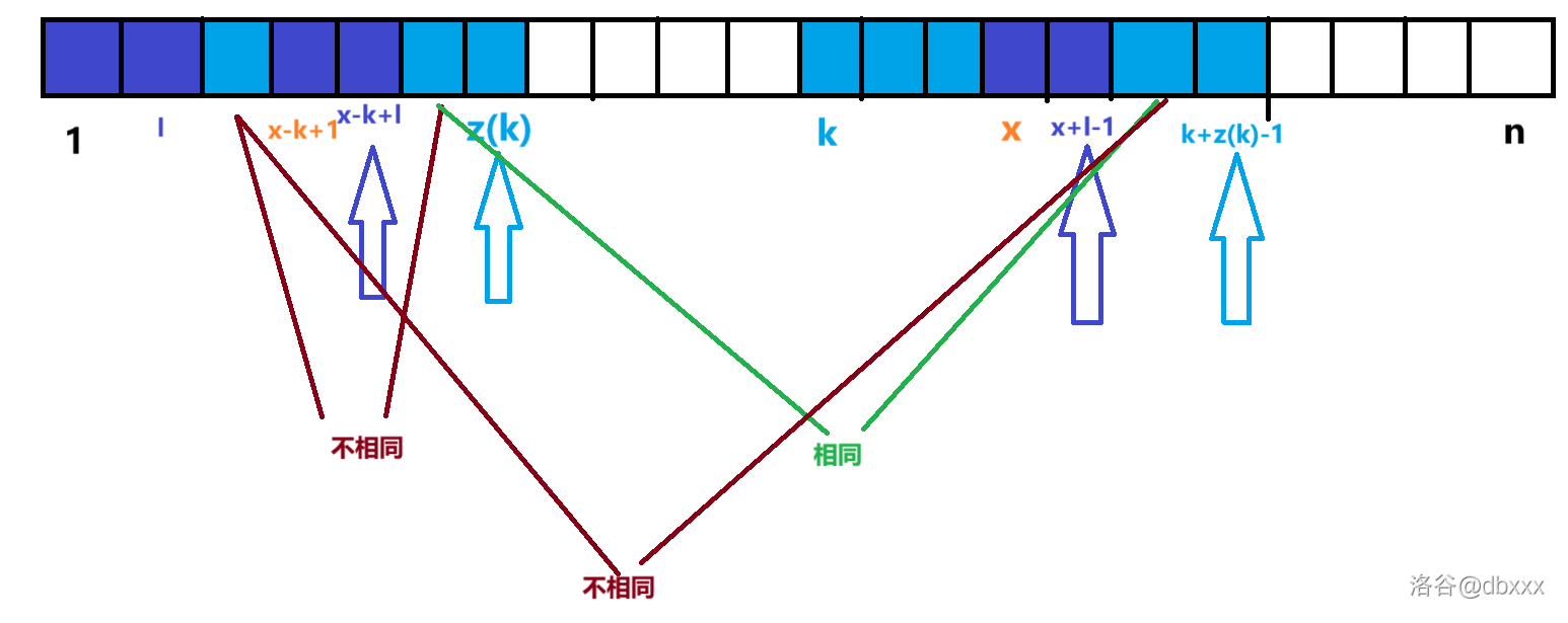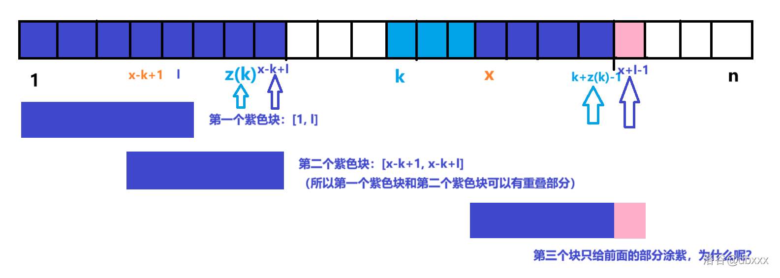 这张图对应的情况是 \(x - k + l < z(k)\)(紫色箭头需要严格小于蓝色箭头),此时 \(z(x)\) 的值已可确定:\(z(x) = l = z(x - k + 1)\)。
