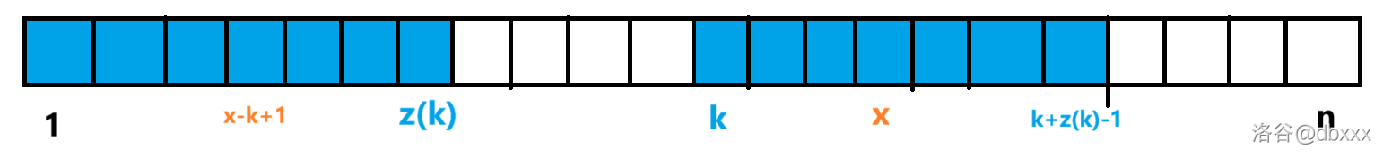 因此,我们现在只能确定不超出的部分仍然对应着 \([x, n]\) 和 \([1, n]\) 的一个公共前缀,但它不一定最长。即,我们此时只能确定 \(z(x) \ge k + z(k) - x\)(\([x, k + z(k) - 1]\) 的长度,在例图中是 \(4\))。如何确定 \(z(x)\) 具体的值呢?