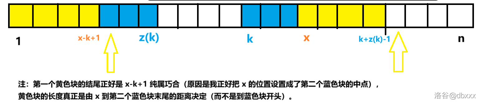 z[i] = k + z[k] - i; // 先将 z[i] 设置为 i 到蓝色块末尾的长度