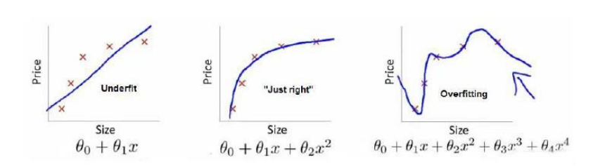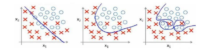 如上图在回归问题上,左图欠拟合,右图为过拟合, 中间的模型拟合效果最佳