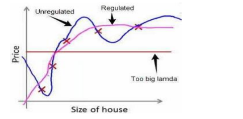 对于上述假设,我们称\(\lambda\) 为正则化参数,如果出现\(\lambda\) 过大,则会导致所有\(\theta\)值减小,导致\(h_\theta(x)=\theta_0\),出现欠拟合情况