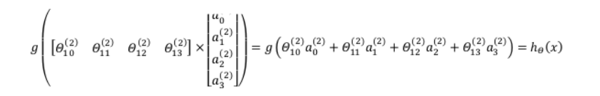 \(h_\theta(x) = g(\theta_{10}^{(2)}a_0^{(2)}+\theta_{11}^{(2)}a_1^{(2)}+\theta_{12}^{(2)}a_2^{(2)}+\theta_{13}^{(2)}a_3^{(2)})\)