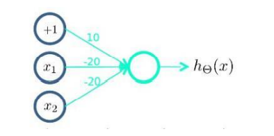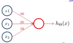 对于上图,我们首先需要在x12的基础上添加一个偏执单元,并为其分配一定的权重,例如-30,20,20,意味着x012的权重依次为上述三个值,我们可以得到\(h_{\theta}(x) = g(-30+20x_1+20x_2)\)