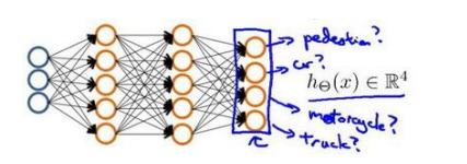 通常情况下,我们会遇到不止两种分类的问题,例如我们使用神经网络算法来识别四类图片,并输出一个四维向量来实现,例如[a,b,c,d],abcd中的任意一个为1,其余三个为0,表示图片为值为1的那类。对于神经网络的结构,可能如下图