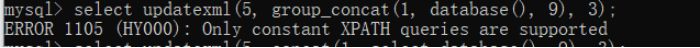 select updatexml(5, concat(1, (select database()), 9), 3);结果: