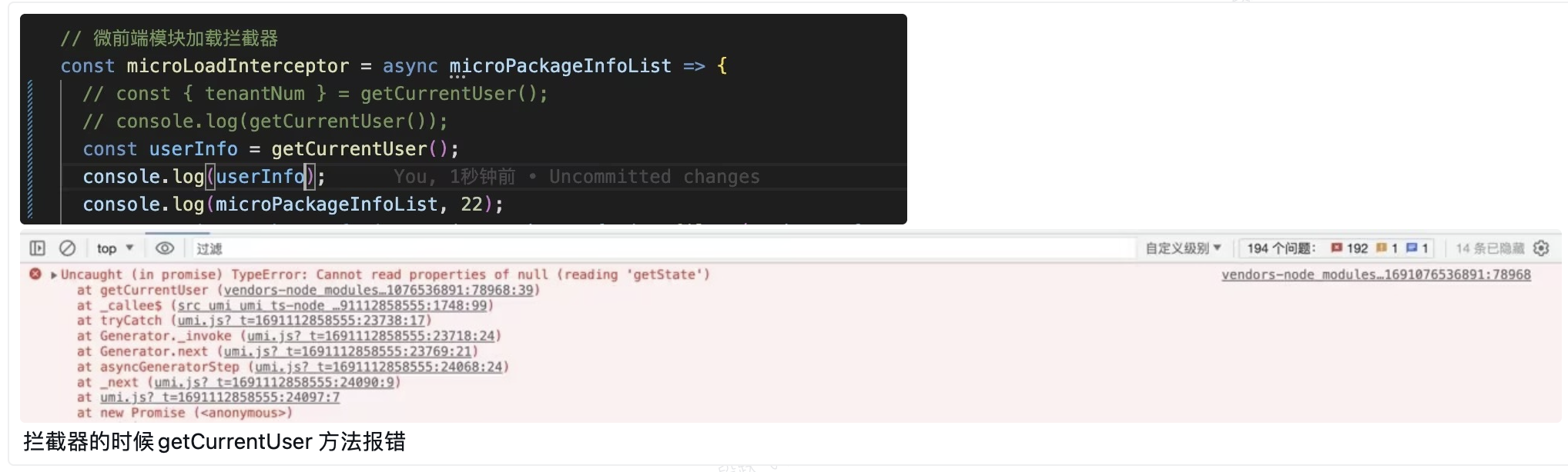 场景:app.tsx 中配置微前端拦截器 调用getCurrentUser获取租户信息时候报错