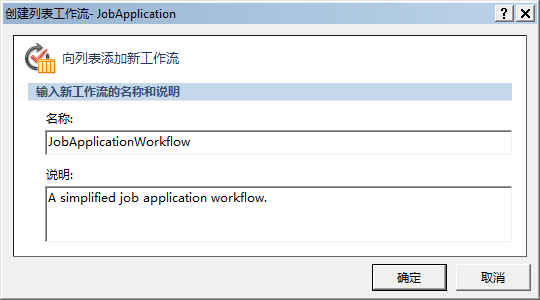 2. 输入名称JobApplicationWorkflow和说明A simplified job application workflow。点击确定。