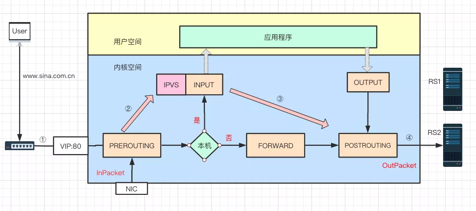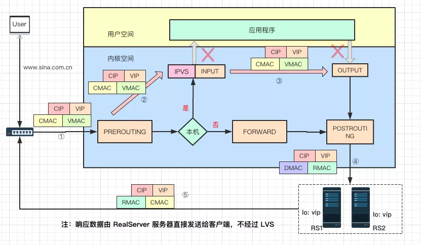 当用户访问 www.sina.com.cn 时,用户数据通过层层网络,最后通过交换机进入 LVS 服务器网卡,并进入内核网络层。