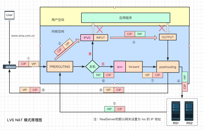 ① 用户请求数据包经过层层网络,到达 lvs 网卡,此时数据包源 IP 是 CIP,目的 IP 是 VIP。